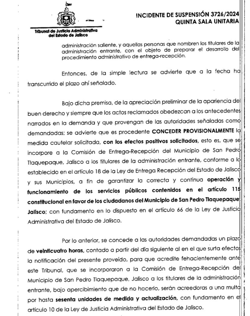 Pérez Segura solicitó las medidas al TJA, a través del Incidente de Suspensión 3726/2024, y que fueron otorgadas por la Quinta Sala Unitaria “a fin de garantizar la correcta continua operación y funcionamiento de los servicios públicos contenidos en el artículo 115 constitucional en favor de los ciudadanos del Municipio de San Pedro Tlaquepaque, Jalisco; con fundamento en lo dispuesto en el artículo 66 de la Ley de Justicia Administrativa del Estado de Jalisco”.